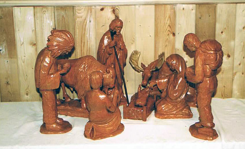 Un chef indien représente les Premières nations et offre la myrrhe (ou une autre résine naturelle du pays). Un Père Jésuite présente l’encens, qu’on trouve dans toutes les églises. Enfin, un voyageur ou coureur des bois canadien avec son sac sur le dos, apporte l’or. Puisqu’il travaille pour de grandes compagnies capitalistes de fourrures, ce rôle lui va comme un gant.