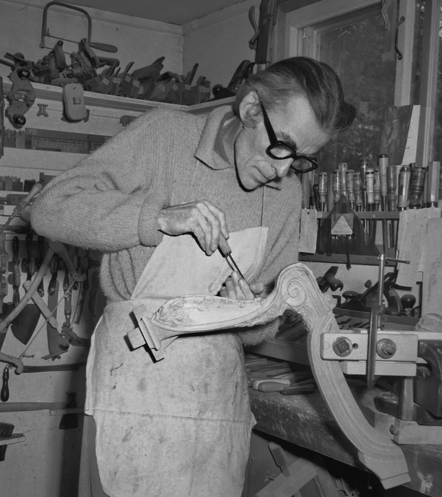 Sous l’œil bienveillant d’une représentation sculptée de saint Joseph artisan en qui il a une grande dévotion, sa collection de vieux outils occupe une place importante dans son atelier mais aussi dans son activité professionnelle. Rien ne le rend plus heureux que de pouvoir les utiliser pour accomplir ses tâches : bouvets, planes, trusquins, guimbardes, guillaumes, tant d’autres aux noms et aux usages aujourd’hui oubliés.