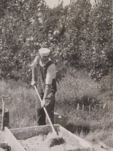 Fernand Bourgault travaillant au revêtement de pierres du chalet du sud, fin des années 40