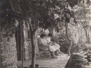 Marie-Rose et fille, lecture sur le perron du chalet du nord, vers 1950