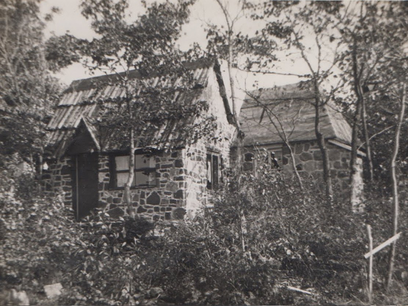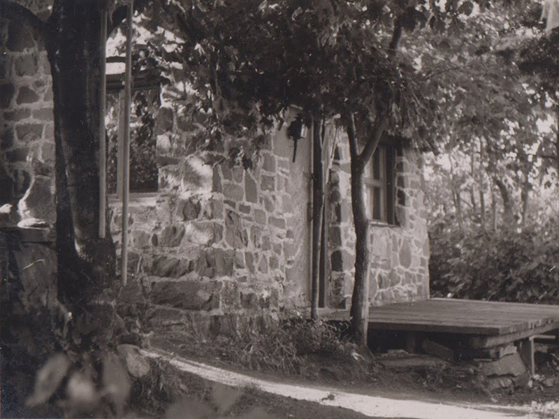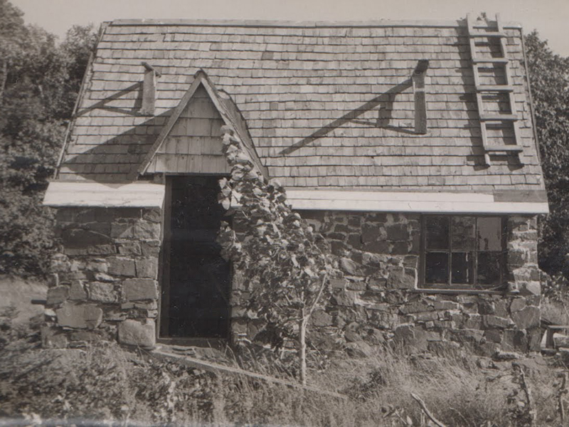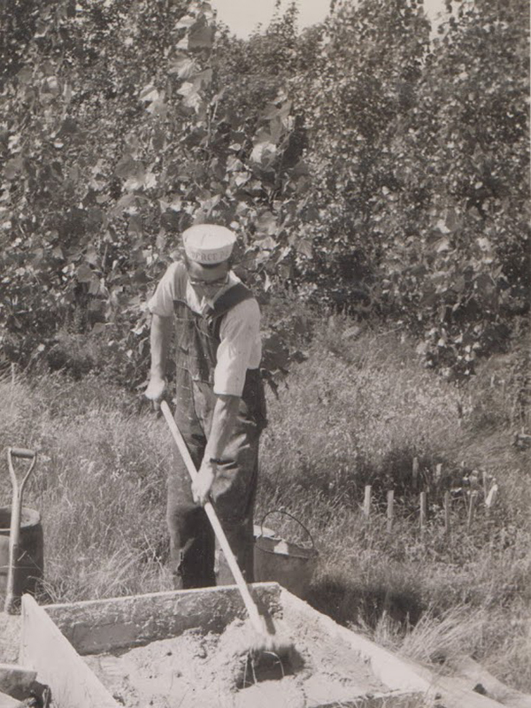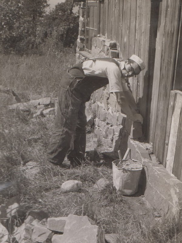 Fernand Bourgault travaillant au revêtement de pierres du chalet du sud, fin des années 40